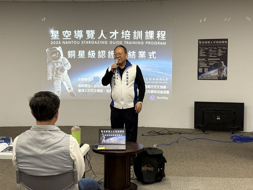 陳處長表示,南投擁有全臺最珍貴的星空資源,合歡山更以「亞洲第三座同時也是華語圈唯一的暗空公園」的認證享譽國際。縣府積極推動低光害環境治理及星空旅遊品牌建構,並獲衛生福利部「健康城市暨高齡友善城市獎」之綠色城市獎及海報獎肯定。同時,縣府也陸續擴散至鹿谷、竹山、魚池、南投市及東埔等地打造特色星空季,未來更規劃推動暗空社區。「再美的星空,也需要有人去詮釋、去說故事。」結訓獲授證的學員,正是南投星空的最佳代言人。