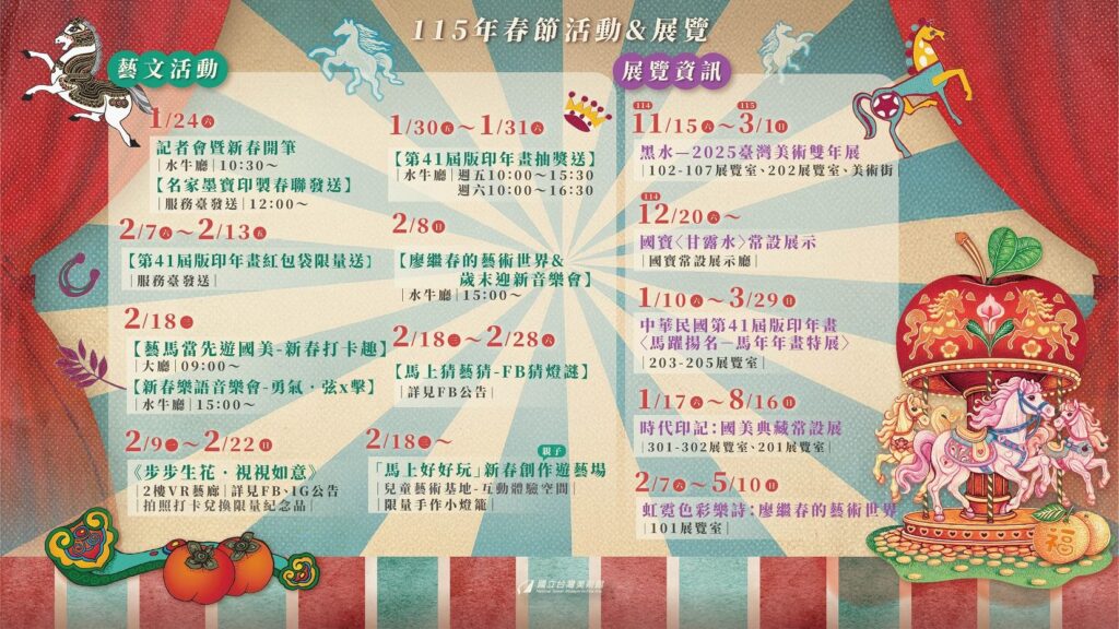 【記者蔡富丞/綜合報導】國立臺灣美術館誠摰邀請全民藝起探春、歡慶馬年!國美館自(24)日起至元宵節,陸續推出「丙午躍春-藝起探春」春節系列活動,包含「新春開筆」、「名家墨寶印製春聯發送」、「版印年畫抽獎送活動」、「藝馬當先遊國美─新春打卡趣」、「新春樂語音樂會」、「FB猜燈謎」等,過年期間亦有「第41屆版印年畫:馬躍揚名–馬年年畫特展」、「虹霓色彩樂師:廖繼春的藝術世界」、國寶〈甘露水〉常設展示等重點展覽,邀請大家齊聚國美館,在藝術與歡樂中迎春賀歲。