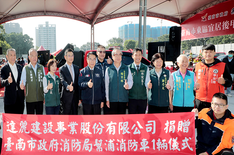 達麗建設除透過都市更新回饋社會住宅外,也於動土典禮現場同步舉行捐贈儀式,捐贈台南市政府消防局1輛幫浦消防車,由達麗建設董事長謝志長代表捐贈,市長黃偉哲代表受贈並回贈感謝狀,展現企業深耕地方、回饋社會的具體行動。