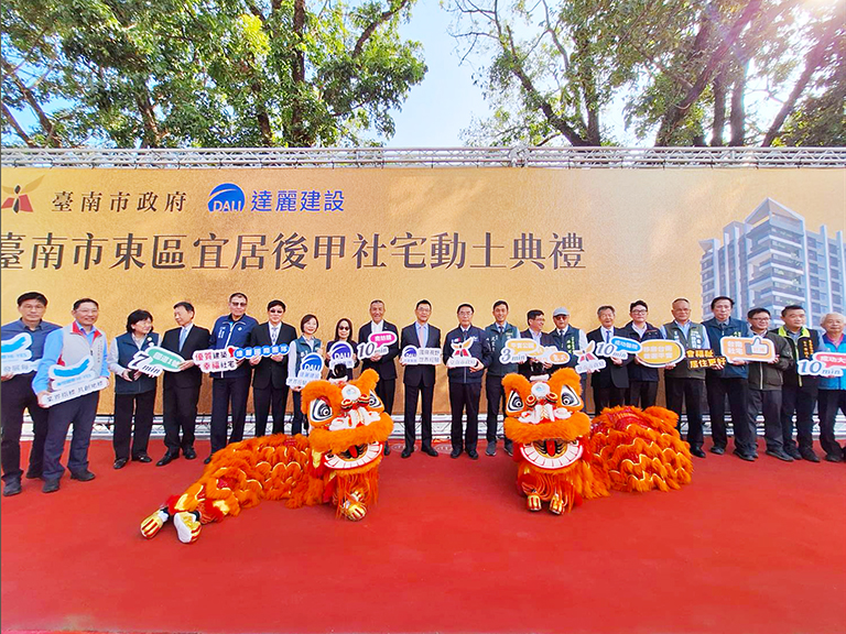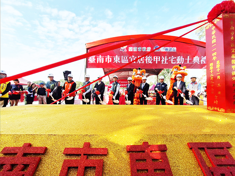 台南市政府今(18)日於東區舉行「宜居後甲」社會住宅動土典禮,象徵市府透過公私協力機制,持續將都市更新成果回饋市民,為落實居住正義再添重要里程碑。市長黃偉哲親自主持動土儀式,與內政部國土管理署署長吳欣修、內政部國土管理署南區都市基礎工程分署分署長林敬賢、總統府國策顧問王永順、地方民意代表等共同見證這項指標性市政建設正式啟動。