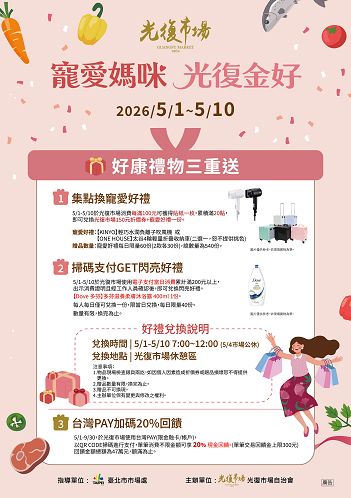 光復市場自治會特別提醒,贈禮兌換為每日上午7:00至12:00,5月4日(週一)為市場公休日,請民眾留意規劃行程。
