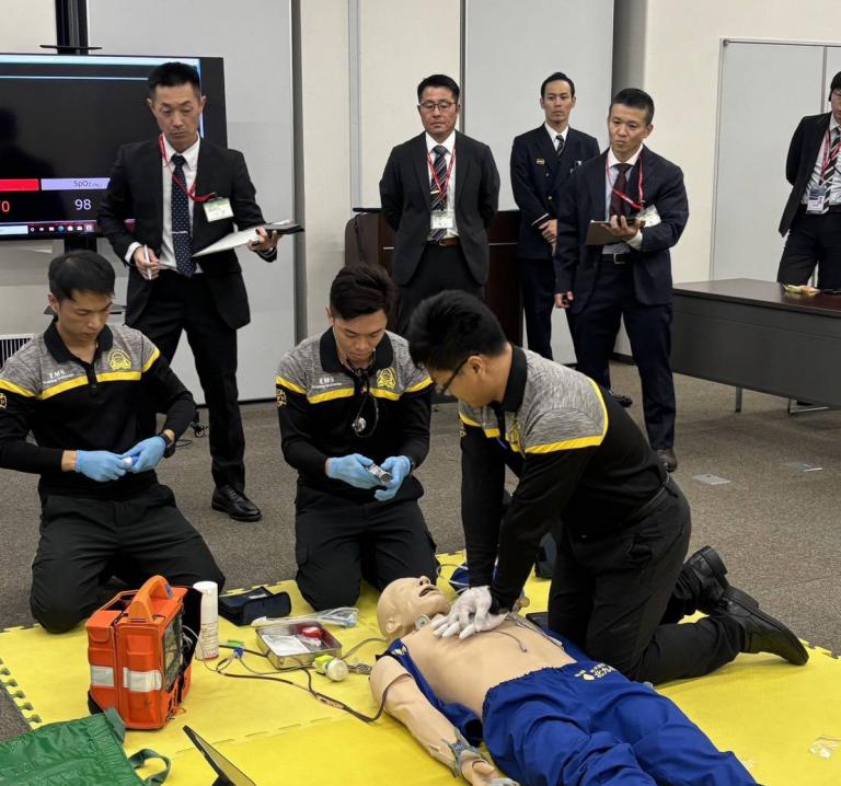 值得一提的是,這次參訪日方特別安排臺灣參訪人員隨同北九州市消防局救護車實際出勤,這是北九州市消防局有史以來首次開放外國消防人員隨車觀摩救護勤務,足見日方對這次交流的高度重視與信任。彰化縣消防同仁藉此親身體驗日本高級救護技術員的出勤流程與救護處置模式,不僅深入了解日本現行的緊急救護制度,也從中獲得許多寶貴的啟發與實務經驗。除此之外,消防局高級救護技術員林忠本、余尚諺及陳嘉樺3人,也在日本九州研修所進行熱中暑救護情境演練示範,以實際操作展現彰化救護人員的專業水準與臨床應變能力,獲得日方講師與學員們一致肯定,充分體現臺日救護交流的成果。