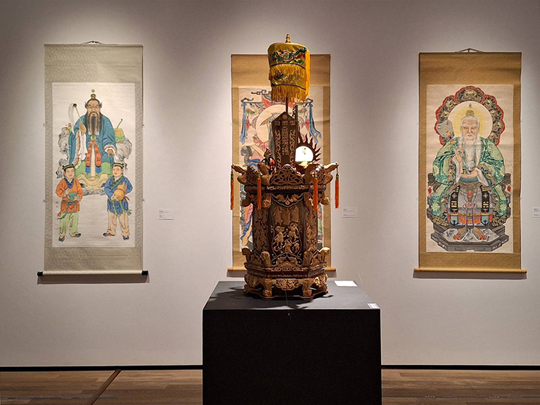 廟口文化與地方小吃也是展覽的重要面向,呈現信徒與小吃共同構築的在地風景。最後,展覽引入臺灣特有的自由與包容視角,展出香港藝術家vawongsir的〈加多雙筷〉及林純用的海廢藝術〈明日餐桌〉,讓傳統文化在創新呈現中煥發新生命。