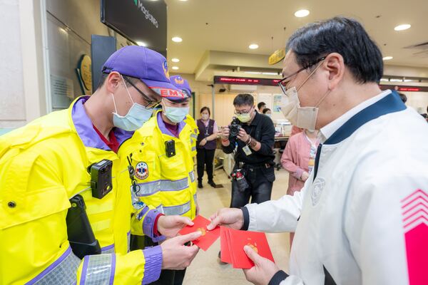 張善政逐一發送新春福袋給辛苦值勤的同仁,感謝他們的辛勞與付出,並祝福所有醫護人員馬年行大運、身體健康、平安順遂。