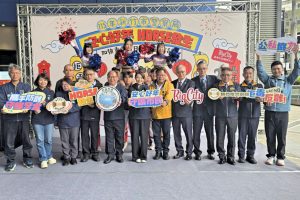 ▲竹市府115年「安心好年.HORSE(好事)發生」加強重要節日識詐宣導活動在遠東巨城購物中心熱鬧登場。市長高虹安(前排左6)、警察局長陳源輝(前排左5)和與會貴賓們一同合影。(圖/竹市警察局提供)