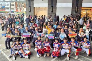 ▲竹市府115年「安心好年.HORSE(好事)發生」加強重要節日識詐宣導活動在遠東巨城購物中心熱鬧登場。市長高虹安(第2排右4)、警察局長陳源輝(第2排右3)和與會貴賓們,以及開場表演啦啦隊、現場共襄盛舉的民眾一同合影。(圖/竹市警察局提供)