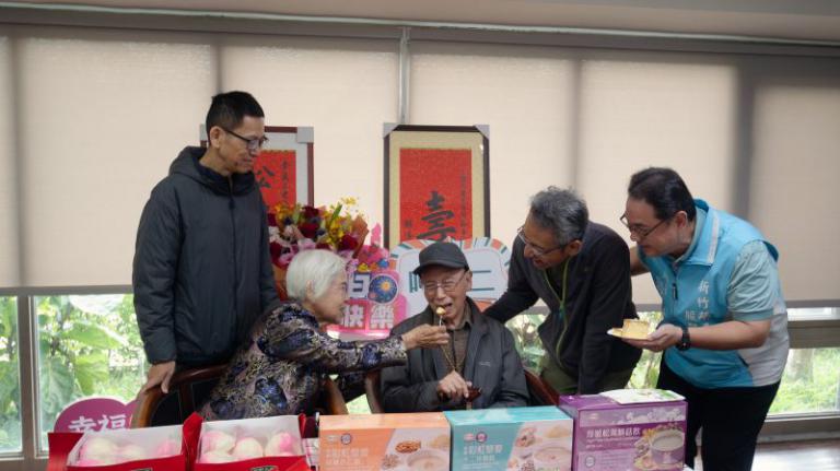 新竹榮民服務處鞠宗顯處長偕新竹市東區後備軍人輔導中心主任黃承澤、光明里長趙強、責任區輔導員、社區服務組長及榮欣志工等一行人,至前往祝賀榮民李義三百歲壽誕,榮服處除代為致贈總統及行政院長百歲壽屏