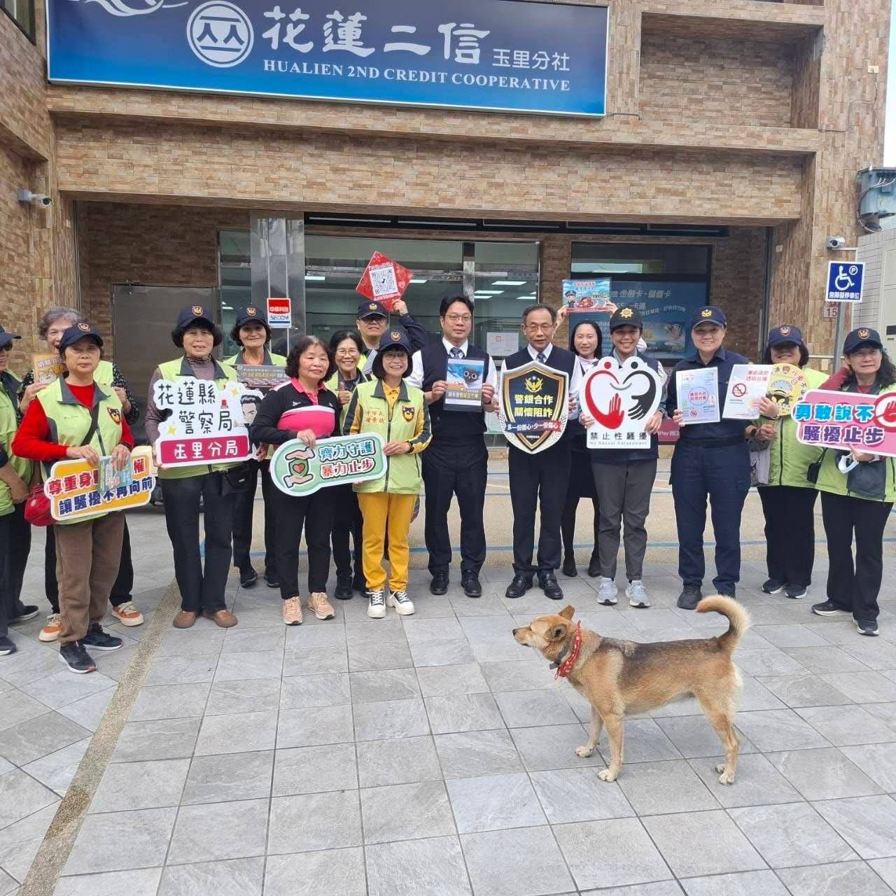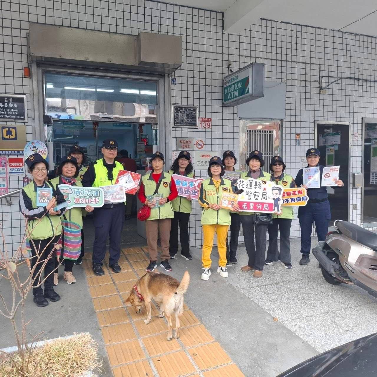 花蓮縣警察局玉里分局為維護春節期間治安平穩、交通順暢,一早由偵查隊、交通組、婦幼及分駐(派出)所人員以「交通、婦幼、防詐、防竊及防搶」等宣導題材,手持宣導標語告示牌並與警察志工媽媽來向現場民眾宣導。