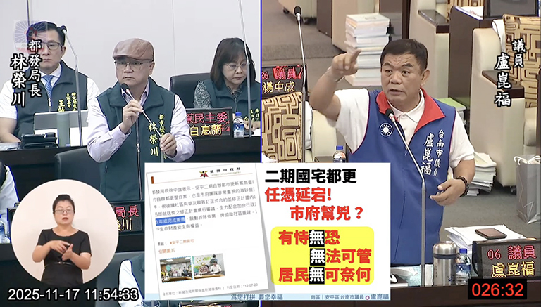 市議員盧崑福說,台南安平二期國宅2014年被鑑定為海砂屋,7年前就要求都更,5年前更認為「公辦都更」是最公平、有效率,市府並爭取中央補助3.75億經費,但疑因時任都市更新科楊姓科長不作為、推給「自辦都更」,廠商一再延宕,導致拆遷費多了2360萬。如今更傳出特定住戶可以選車位、選店面,住戶沒有信託同意就沒法選車位,一有意見就被指是阻礙開發,遭到變相恐嚇,廠商有恃無恐、市府無法可管,居民無可奈何。