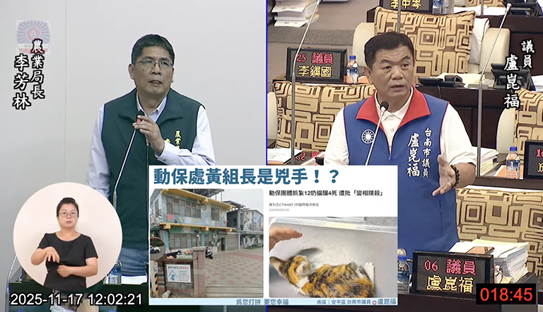 市議員盧崑福接獲陳情,動保處疑因把9隻剛出生不到3個月,體重不到1公斤的流浪奶貓結紮,術後未經傷口癒合就野放,導致奶貓傷口發炎、潰爛,痛苦死亡,嚴重違反公貓至少3天、母貓7天照護規定,質疑市府多年來對奶貓實施不當結紮,造成不明數量小生命冤死,要求動保處停止對乳幼貓絕育的不人道作法,並請市長提出後續改善及防止重蹈覆轍的措施。