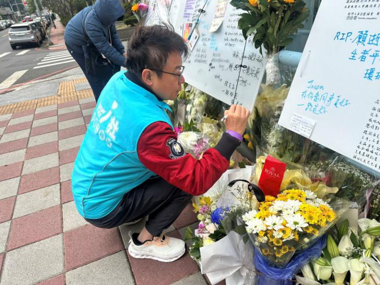 ▲眾人在事故地點獻上鮮花與心意,期盼掃除「行人地獄」噩夢。(圖/記者蔣彤雲攝)