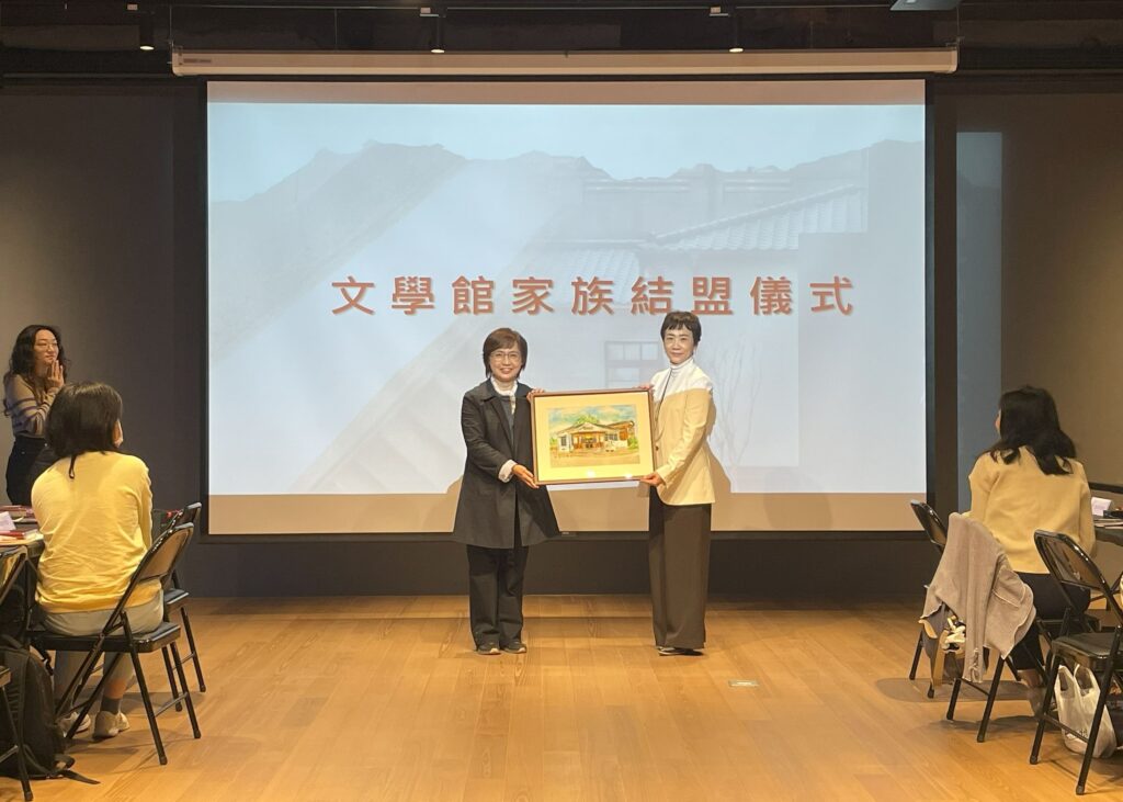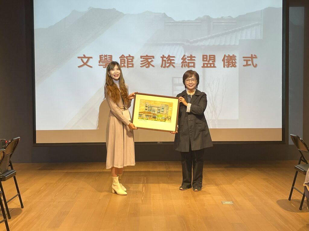 會議首先由臺文館陳瑩芳館長致歡迎詞,強調臺文館搭建「文學館家族」平台,串聯全國文學館舍成為彼此合作夥伴,協力共同「增能、培力、共創、共享」之初衷。她表示,今年也是文學館家族成長的豐收年,7月有清華大學的王默人周安儀文學館加入,此次則再添嘉義文學館和桃園文學館兩名生力軍,將可為文學推廣注入嶄新活力。結盟儀式由陳瑩芳館長致贈建築彩繪畫作,嘉義市文化局圖資科王詠紳科長、桃園市政府文化局文化發展科胡心慈科長分別代表接受,象徵兩館正式成為文學館家族成員。