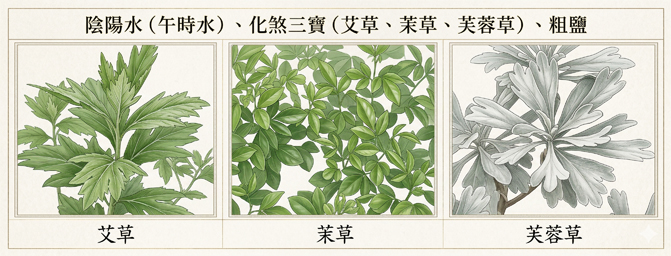 準備一桶「陰陽水」加入化煞三寶:艾草+茉草+芙蓉草,倒入粗鹽。若有「午時水」(端午節正午12時取的水)可加入強化,陽氣最足。從頭洗到腳,洗完立刻換上乾淨衣物。在藥草學中這三種草藥均有抗菌、淨化空氣的實證功效;粗鹽水能清除皮膚表面的雜質與靜電殘留。古人叫「化煞」,現代人叫「芳香淨化浴」,原理一樣。