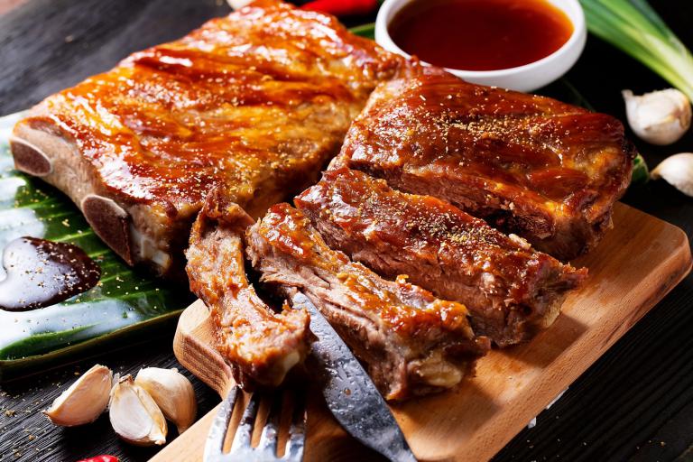 ▲碳烤豬肋排外層微焦、肉質飽滿,成為餐桌上最具人氣的一道,也為年夜飯增添熱鬧氣氛。(圖╱記者孔亮云翻攝)
