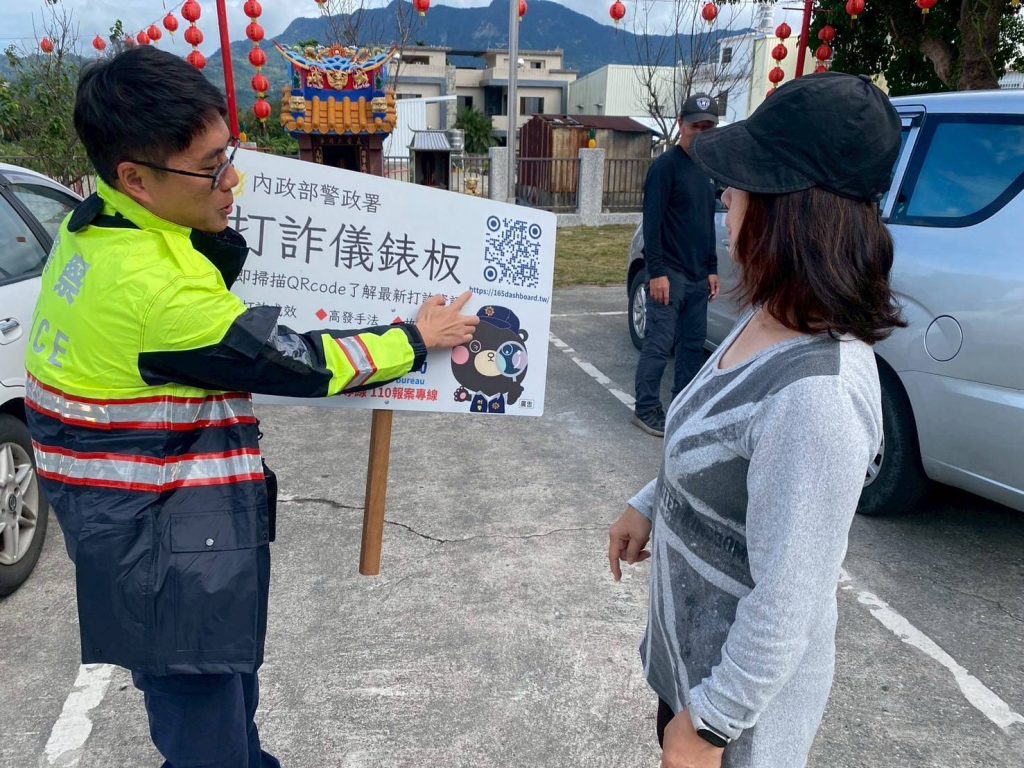 為提升防詐騙及交通安全宣導成效,拉近警民距離,臺東縣警察局關山分局鹿野分駐所所長陳泰山率同所內員警,於假日前往鹿野鄉龍田村知名觀光景點「龍田神社遺跡」,以大型手舉牌方式,向前來參訪、拍照的遊客進行防詐騙及交通安全宣導,透過輕鬆互動的方式,將重要的治安與用路觀念深植民眾心中。