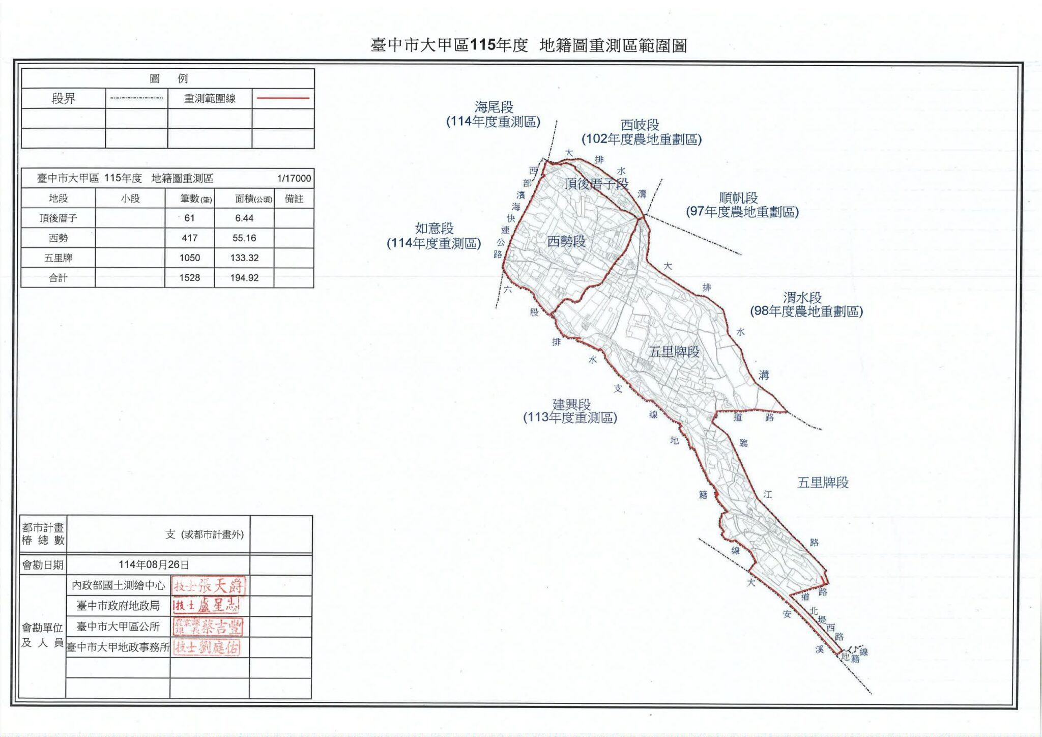 大甲地政事務所主任許世強指出,115年度預計辦理大甲區頂後厝子段 61 筆、西勢段 417 筆、五里牌段 1,050 筆土地,共計 1,528 筆、面積約 195 公頃的地籍圖重測計畫。此次作業將導入最新測量儀器與技術,重新繪製更精準可靠的地籍圖。為便利重測區土地所有權人參與,說明會選在大甲區龍泉里活動中心舉行,讓民眾可就近參加,減少舟車往返的不便。