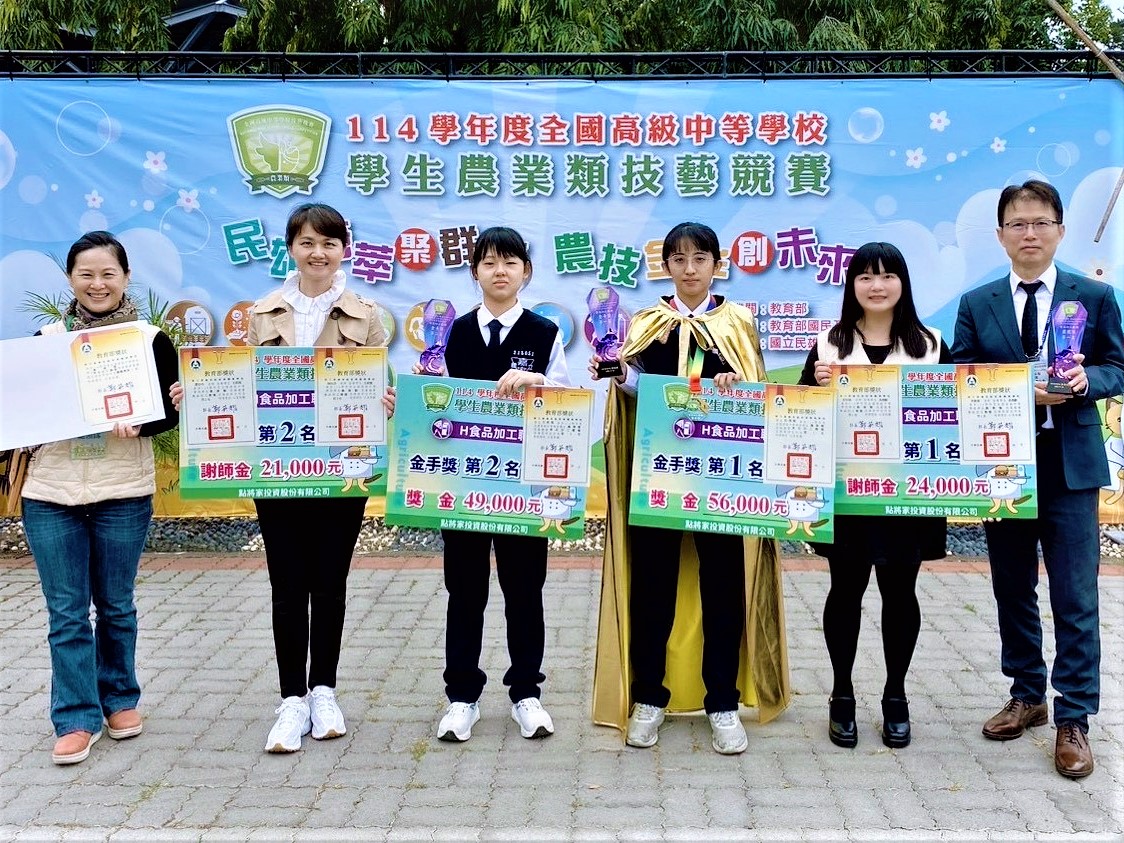 食品加工職種吳翊斳同學與王莉雅同學,分別榮獲第1名及第2名金手獎;美顏職種林芸榛同學及李雅萍同學,分別榮獲第1名及第5名金手獎;美髮職種沈梓晴同學和王惠青同學,分別榮獲第1名及第8名金手獎;服裝設計職種顏以嘉同學及黃品瑄同學,分別榮獲第4名金手獎及第8名優勝;中餐烹飪職種蔡祐誠同學,榮獲第5名金手獎;餐飲服務職種何芝云同學,榮獲第7名金手獎,服裝製作職種林美琇同學,榮獲第7名優勝;幼兒教具職種張家瑜同學,榮獲第18名優勝。