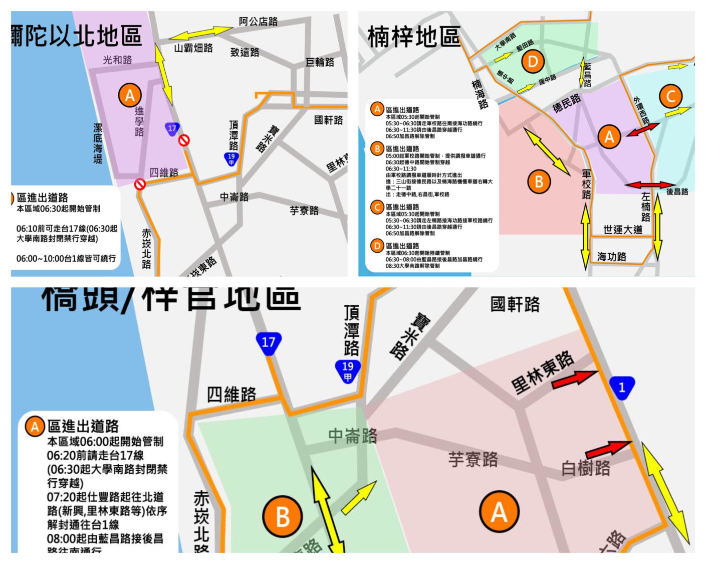 一、赤崁北路及赤崁東路上午6時40分至9時40分雙向管制,請民眾提前規劃路線並改道行駛。