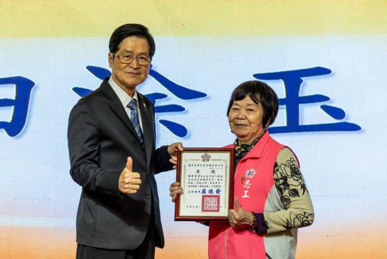 ▲輔導會嚴德發主委頒發資深志工獎予田涂玉雲女士。(圖/新竹榮服處提供)