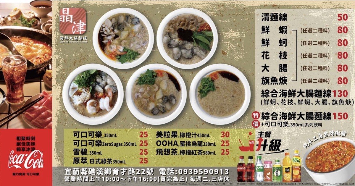 如今的晶津海鮮大腸麵線,不只是礁溪的一間小吃店,更是一碗凝聚了時間、熱情與真誠的料理。晶姐說:「我相信用心煮的食物,客人都吃得出來。」店面就位於礁溪柯氏蔥油餅對面,如果你也想嚐嚐這份來自海的鮮甜,只要進店說出「晶姐我愛你」,還能獲得神秘小禮物,一份來自料理人最真誠的心意。