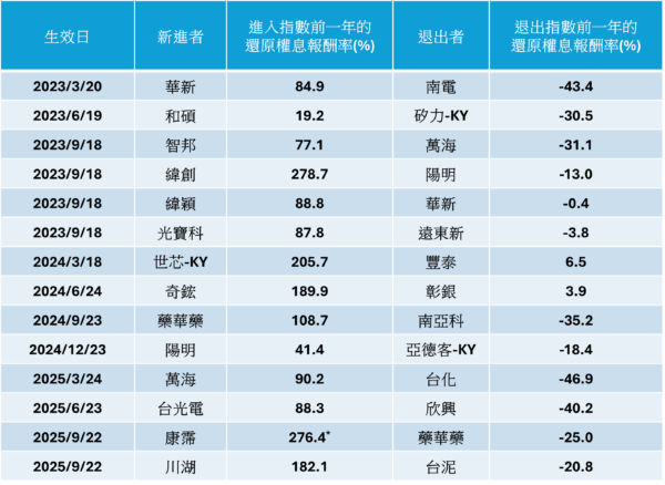根據CMoney統計2023年以來台灣50指數每一季納入和剔除的成分股,在指數生效日往前回推一年的含息報酬率,期間新納入的14家公司有11檔的漲幅達到8成以上,其中6檔的漲幅還超過一倍,最高的是2023年的緯創,納入前一年的含息總報酬高達278%,14檔平均的漲幅是129%。