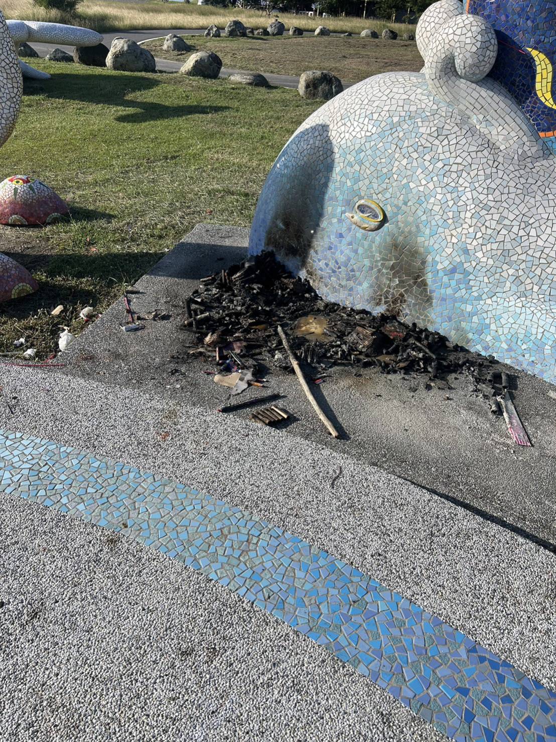 臺東市海濱公園的海洋意象廣場,日前疑似遭不明人士在廣場施放煙火,除在現場留下垃圾外,也造成馬賽克磁磚破損及地面焦黑痕跡,影響市容觀感,也讓深受市民與遊客喜愛,成為散步、遊憩與拍照的景點,蒙上焦黑痕跡與片地垃圾。