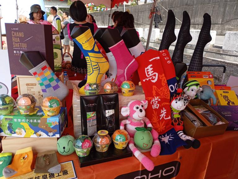 ▲這次活動有全國最大的優良織襪特色產品展示會及台灣製MIT微笑標章精品展售,還有「用愛心兌好襪」活動,只要憑114年11、12月發票兩張即可兌換社頭好襪一雙,如果在活動會場或鄉內各景點拍照打卡,即可再兌換一雙(好襪數量有限,送完為止)。(圖╱記者孔亮云攝)