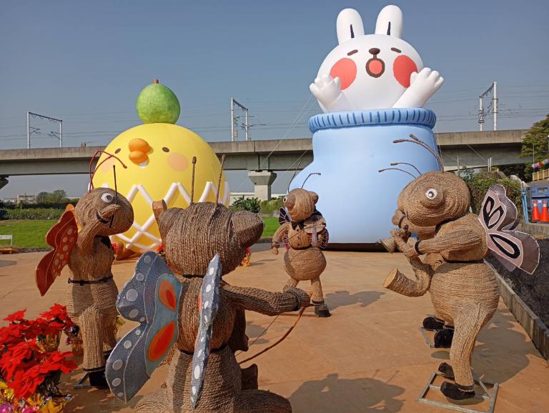 ▲這次活動在杜鵑花大道(忠義路)規劃花海、稻草創意裝置藝術及大型氣偶,且今年更與「懶散兔&啾先生」合作,獲得授權製作出超級卡哇伊的氣偶,屆時將和其他氣偶同步展出,一起萌翻造訪社頭的遊客們。(圖╱記者孔亮云攝)